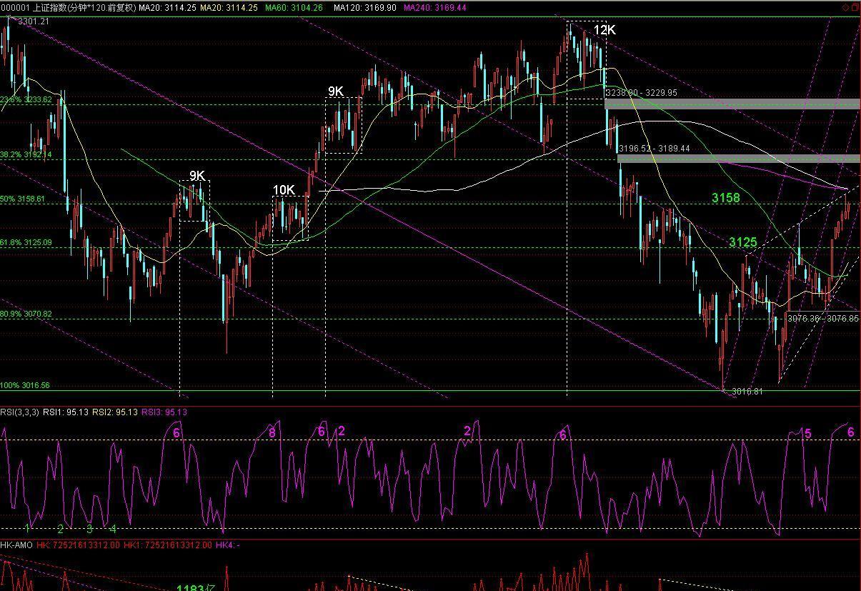 1、60日和120日均线死叉粘合于3170附近。3016以来的第一个和第二个高点连线下周初也位于3170附近。故下周初3170是一个重要的阻力位。