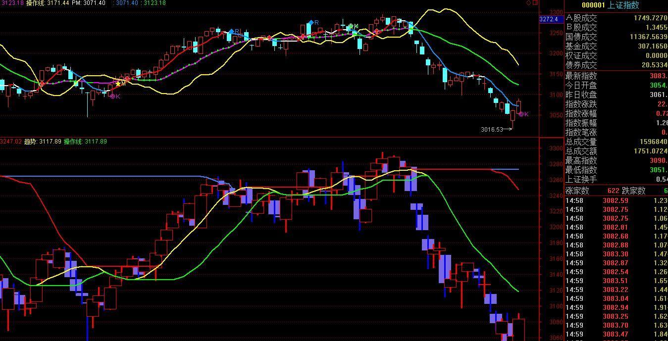 由于目前身处欧洲洽谈项目,分析股市的时间较少,故今日主要采取了简单易懂的主图操作指标,主图指标中已经发出了短期操作指标K,预示着大盘短线还有上攻力度,将突破周五盘中的最高点3090.49点,同时需结合附图指标中的绿色操作线的压力位,其指标周五落在3117点,且慢慢下移,其操作意义在于,大盘短线面临着此条操作线的反压,是否能顺利突破取决于量能是否可以有效放大,但无论是否突破,都必须小心大盘下探并创新低的可能,仓位上需要谨慎控制。此外也需要防止本周强势的三大超级权重板块的补跌,逢反弹可以根据手中的持仓成本已经反弹的力度进行高抛低吸,不要担心踏空,后市一定会给出更明确的买入机会。