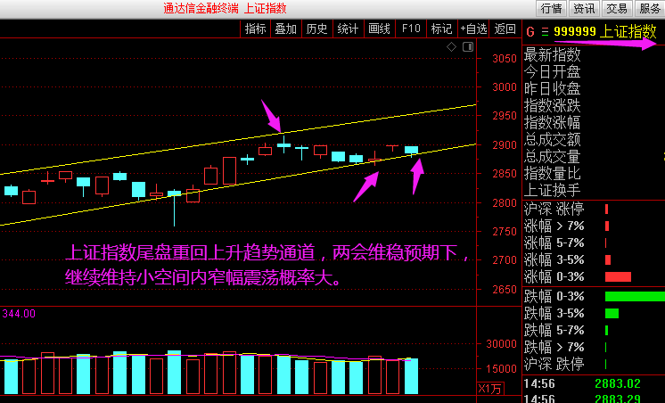 股市温度31度,表明日内处于弱势区域。今天市场走势符合老岳预期,盘前提示:市场昨天高开一步到位,高位缩量横盘一天,再次到达上方压力区附近,一旦突破前高有望出现60分钟更高级别的顶部结构。预计今天指数盘中还有冲高,操作上短线仍以高抛不追高为主。市场早盘窄幅震荡,早盘开盘冷暖主力资金主要介入新能源汽车产业链板块,全天处于领涨状态。随后农业和光刻胶科技股快速修复走高,主板券商跟随拉升,无奈持续性没能延续。午后银行板块直接护指数一波强拉升,但其他板块基本不跟,指数进一步杀跌,直到尾盘才有所修复。AI量化股市温度从早盘开盘的45度,回升到收盘的31度,个股跌多涨少,赚钱效应快速降温。盘中讲到的农业,食品等趋势板块以及近期领涨强势股纷纷收出阴线,短期面临整理,短线操作难度或许增大。昨天收评讲到目前指数已处于强压区附近,短线偏谨慎看待,创业板指数一旦再次突破前高,60分钟级别又将形成顶部结构,大概率是周三,今天走势符合预期,目前仍处于整理周期。两会维稳预期叠加量能不能有效放大的情况下,目前只能维持窄幅震荡,上证指数尾盘再次回到上升通道下轨支撑上方,短期维持窄幅震荡看待。这个位置短线仍以不追高,控制仓位为主。目前市场主要围绕,新能源产业链以及走趋势的农业,食品,光刻胶等科技股板块反复轮涨格局。